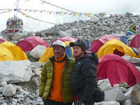 After an early lunch, a few of us decided to ignore medic’s advice and head up to Base Camp. One thing that has become increasingly apparent to me up here this time is how unstable this glacier is compared to 3 years ago. The ceracs coming off the Khumbu Glacier are a fraction of the size, and constantly under the glacier you can here the torrent of melt-water running underneath. That was not a sound I heard at all last time. This year has been the hottest and driest that the guides can remember. Whether it’s a freak year or Global Warming I don’t know, but if it’s the latter then that is genuinely disturbing.Base Camp is a cool place and we had a good wander. We had tea at the HRA hospital tent, met some climbers. I got invited to meet ‘The Colonel’ at the Indian Army Expedition tent. Nice bloke. Wanted to send his boys down for a game of cricket! Told him no as we only have a licence for one game and I didn’t want to get arrested!